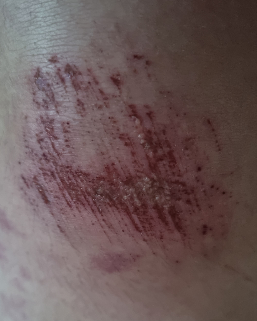 찰과상을 입은 상처로 특별히 이차적 감염 및 염증 등 합병증이 동반된 것으로 의심스럽지는 않아 보입니다. 상처 회복 과정에서 진물이 나는 것은 흔한 증상입니다. 적절하게 소독을 하고 연고를 발라주며 드레싱을 교체해주다보면 서서히 좋아질 것으로 사료됩니다.