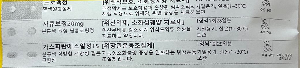 사진의 약은 위점막보호제(프로맥정)와 위산억제제(자큐보정 20mg)와 위장운동조절제(가스피란에스알정 15)로 보이는데, 술은 약과 “큰 위험한 상호작용”이라기보다 역류와 속쓰림 자체를 악화시켜 약효를 떨어뜨리기 쉬워 치료 중에는 피하시는 편이 좋습니다. 꼭 드셔야 한다면 복용 직후 음주는 피하고 최소 4에서 6시간은 간격을 두고 공복 음주를 하지 않는 방식으로 줄이시는 것을 권장드립니다. 술을 마신 뒤 속쓰림이 심해지거나 구토, 흑변, 피 섞인 구토가 있으면 그날은 더 이상 드시지 마시고 약 복용도 재조정이 필요합니다. 감사합니다.