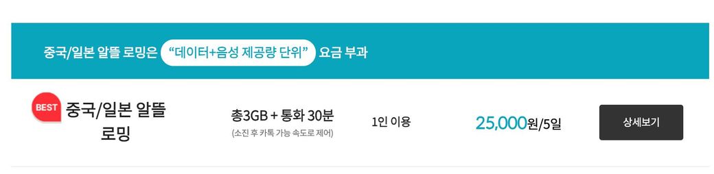 안녕하세요 부모님께서 내일 중국 패키지 여행을 가시는데 조금전에도 비슷한 글을 올렸는데 걱정되는 마음에 다른 궁금한것이 생겨 질문을 드립니다. 아직 로밍을 안하셨는데 저도 로밍을 해본적이 없어 어떻게 해야될지 모르겠더라구요. 일단 kt 홈페이지에가서 찾아보니 여러 요금제 중에 아래 올린 이미지 요금제가 괜찮아 보이긴한데 아버지는 로밍을 안하시고 어머니만 로밍을 해서 저녁에 연락만 가능하게 할려고 하는데 저 요금제 괜찮을까요? 그리고 신청을 하면 지금 기존에 한국에서 사용하는 요금제와 로밍 요금제 2개가 생기고 4박5일이 지나면 자동으로 없어지는 건지 궁금하고 또 25000원 요금은 언제 청구가 되는지도 궁금합니다.