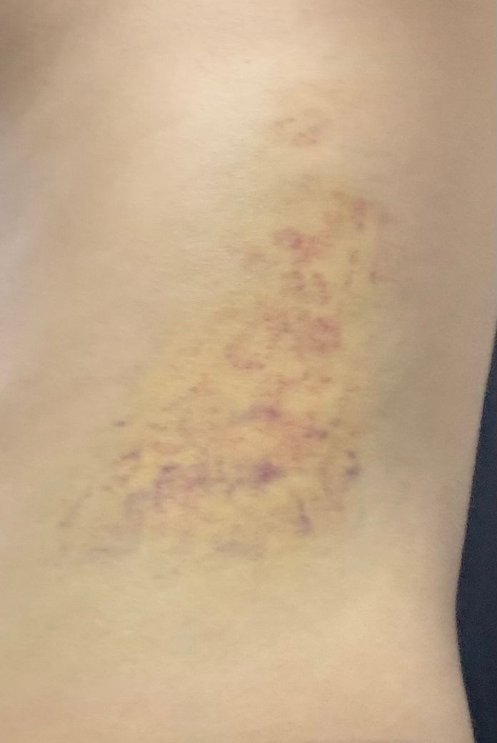 사진상으로는 옆구리에 넓게 퍼진 타박상으로 보이며 시간이 지나면서 색이 퍼지는 것은 흔한 경과입니다.