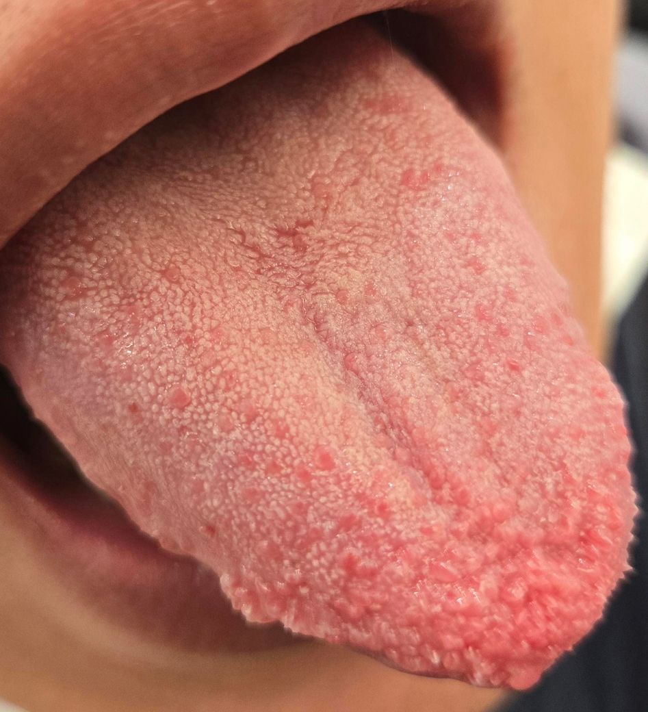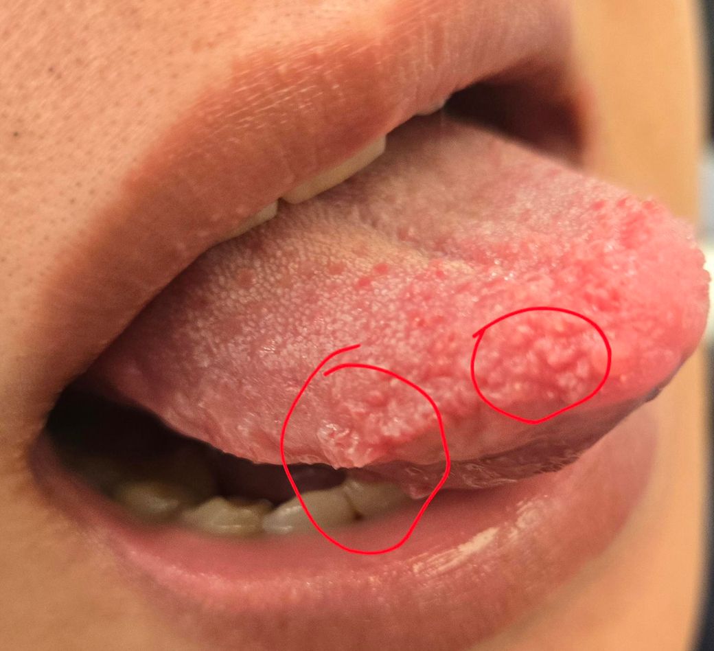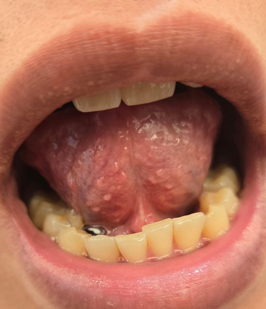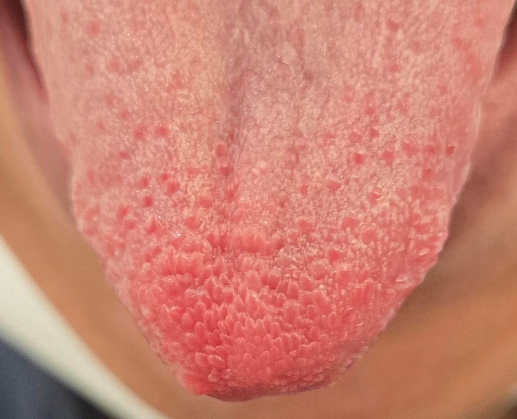 혀 끝과 앞쪽에 보이는 울퉁불퉁한 돌기들은 주로 버섯유두(fungiform papillae)입니다. 미각을 담당하는 정상 구조물로, 피곤하거나 면역 저하, 구강 건조, 자극적인 음식 섭취, 혀를 자주 관찰하거나 만졌을 때 일시적으로 붉어지고 부각되어 딸기혀처럼 보일 수 있습니다. 사진에서 보이는 양상은 대칭적이고 표면이 균일해 HPV 사마귀에서 보이는 꽃양배추 모양이나 단단한 각질성 증식과는 다릅니다.