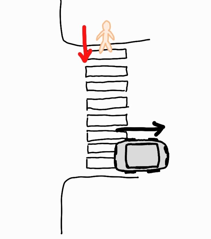 차량 우회전 할 때, 차가 황단보도를 지나가는 타이밍에 사람이 건너기 시작하면
