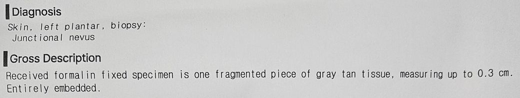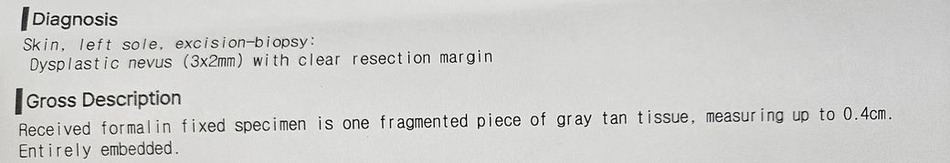 진단: Dysplastic nevus (3x2mm) with clear resection margin