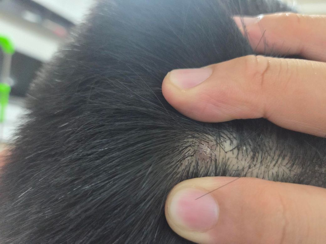 사진과 경과를 종합하면 단순한 일시적 딱지라기보다는 만성적으로 지속된 피부 병변으로 판단됩니다. 3년 이상 유지되고, 건드리면 통증이 있으며 반복적으로 뜯는 행동이 있었다는 점에서 염증이 지속된 모낭염 형태이거나 육아조직처럼 변한 병변 가능성이 높습니다. 일부에서는 사마귀도 감별이 필요하지만, 현재 양상은 염증성 병변 쪽이 더 의심됩니다.
