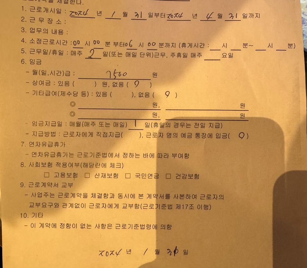 24년 1월 31일부터 지금까지 00:00 ~ 6:00 까지 토,일 편의점 야간알바를 하고 있습니다.
