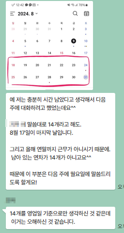 연차 14개를 전부 사용할 경우 오늘이 마지막 근무일인데, 이를 회사에 알렸더니 사진처럼 저보고 잘못 계산했다고 합니다.