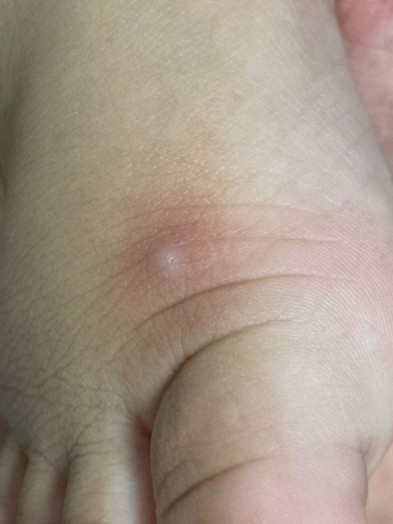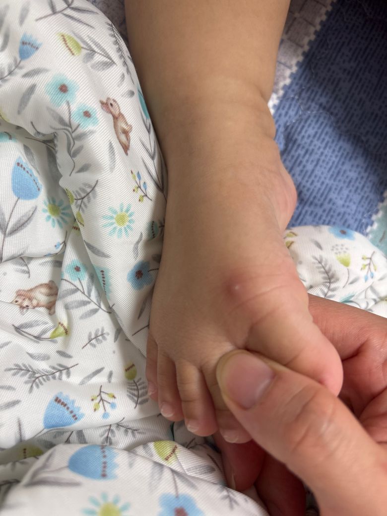 아기 발등에 지금 2주정도 됐고요 딱딱하고 동그랗게 올라왔어요 만지면 아프다고 소리 지르거나 그러진 않는데 발을 살짝씩 치내는 정도에요