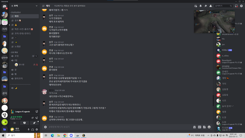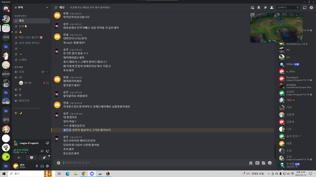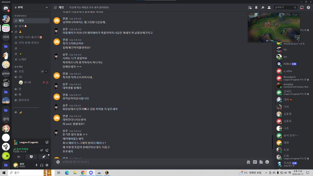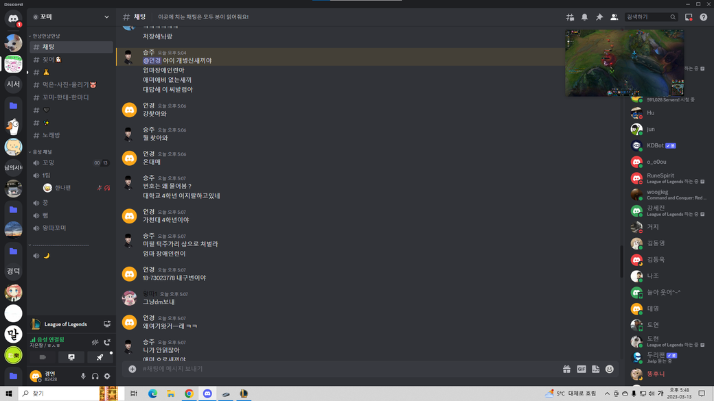 디스코드채널에 100명이상 있는사람이 있는상태이고 저를 직접 태그하면서 저에게 부모님욕과 각종 욕설을 하였습니다.