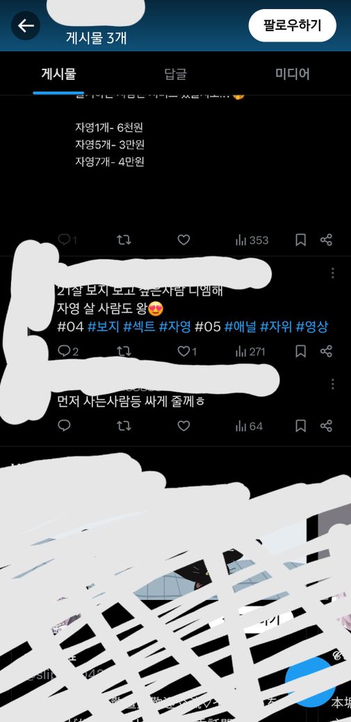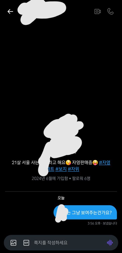 먼저 상대방의 프로필의 '21살 서울 사는---'라는 문구로 보아 아동청소년이 아님을 확인하였으며 그 사람의 이전 글의 '21살 ○○보고 싶은 사람 디엠해---'라는 글을 보고는 오늘 오후 3시 56분경 "○○는 그냥 보여주는 건가요?"