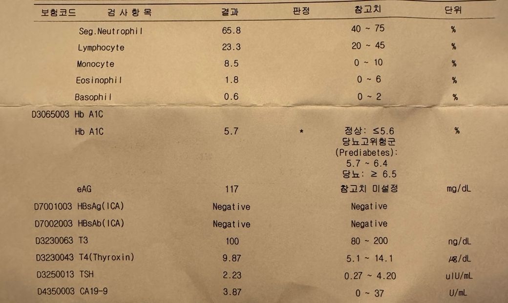 피검사 결과는 백혈구 수치, 적혈구 수치, 헤마토크리트, 혈소판, 간 기능 검사 (ALT, AST), 전해질 (나트륨, 칼륨, 염소), 그리고 콜레스테롤 등 여러 항목이 포함되어 있으며, 대부분의 결과가 정상 범위 내에 있어 큰 문제는 없어 보입니다.