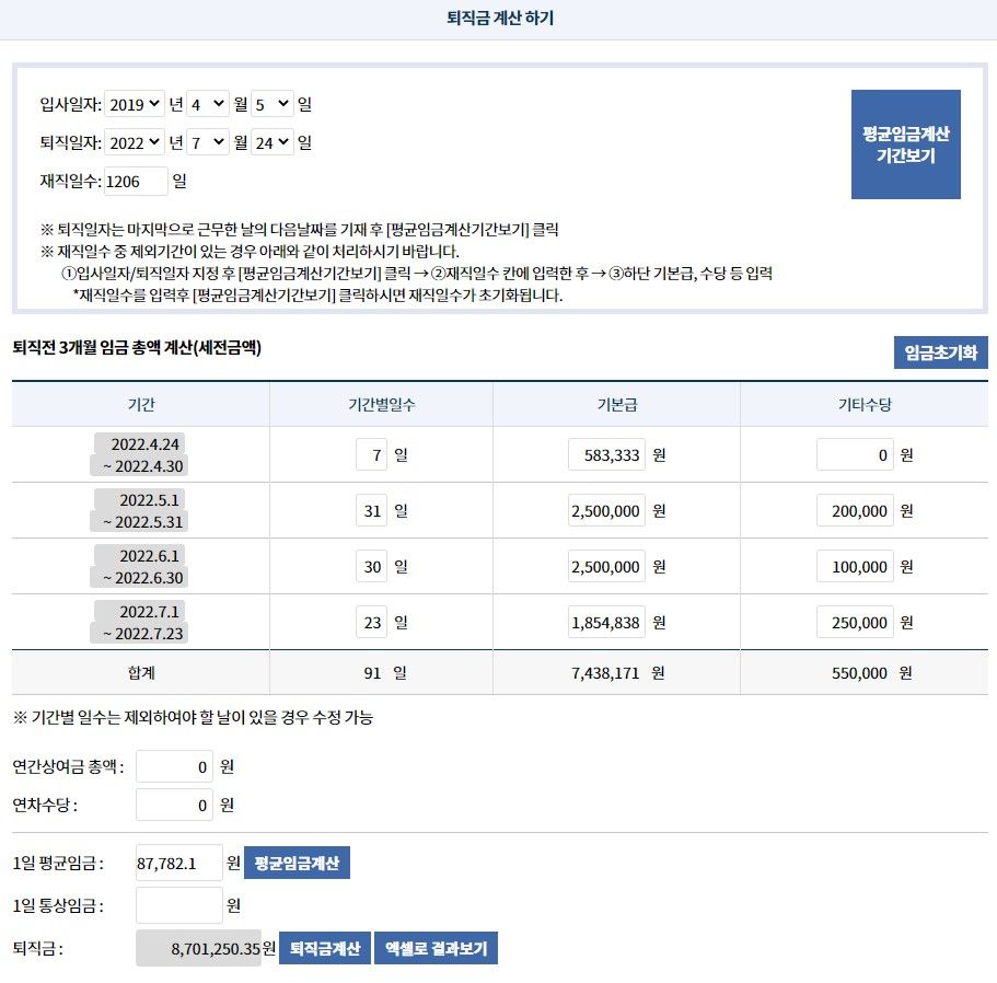 마지막 근무일이 7/23인 직원의 퇴직금 계산을 아래와 같이 하였는데, 맞는지 궁금합니다.