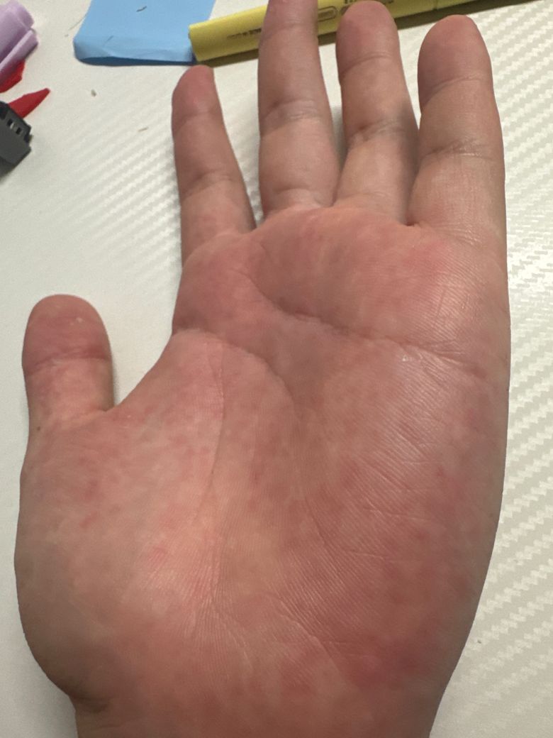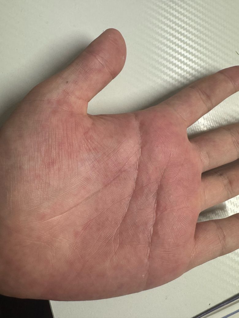 사진 양상과 “저녁만 되면 간지러움 → 긁으면 부어 오르며 돌기처럼 나타남”이라는 패턴은 대부분 물리적 두드러기(압력·마찰 두드러기) 혹은 콜린성/온도 변화 관련 두드러기에서 흔히 보입니다. 특히 손바닥은 마찰이 잦아서 국소적으로만 나타나는 경우가 자주 있습니다.