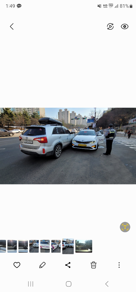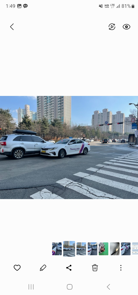 상대 택시는 직진 노면 표시를 위반하여 우회전 하였기 때문에 노면 표시 위반 차량의 과실 100%로 처리가 됨이 맞습니다.