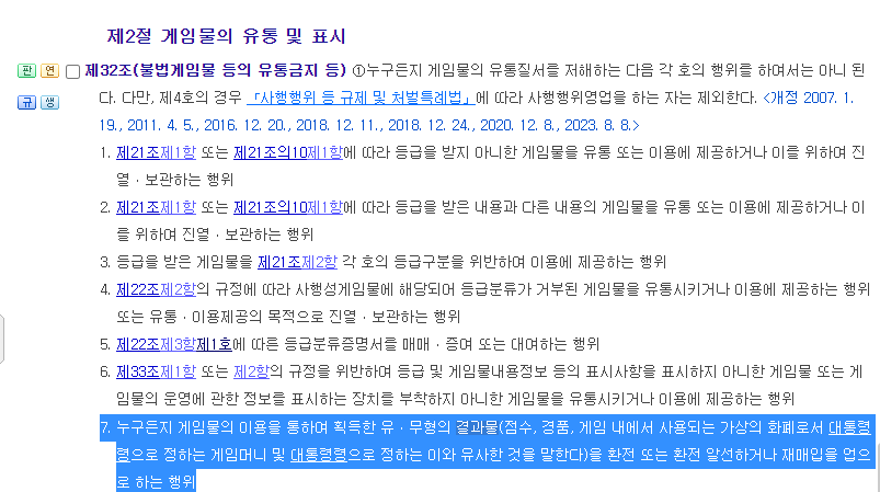 게임법에 따르면 게임내 재화를 현금화하거나 알선하는 걸 법으로 금지해놨습니다. 그런데 아시다시피 게임머니 거래를 위한 수많은 거래사이트() 및 업체가 있습니다. 이 문항은 사문화된 법인가요?