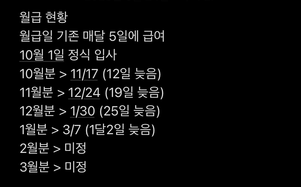 사진은 제가 정리해 놓은 급여 현황이고 언제 입금이 됐는지 (입금내역 있음) 얼마나 체불 됐는지 밀린 것들 또한 제가 다 정리하여 적은 것입니다.