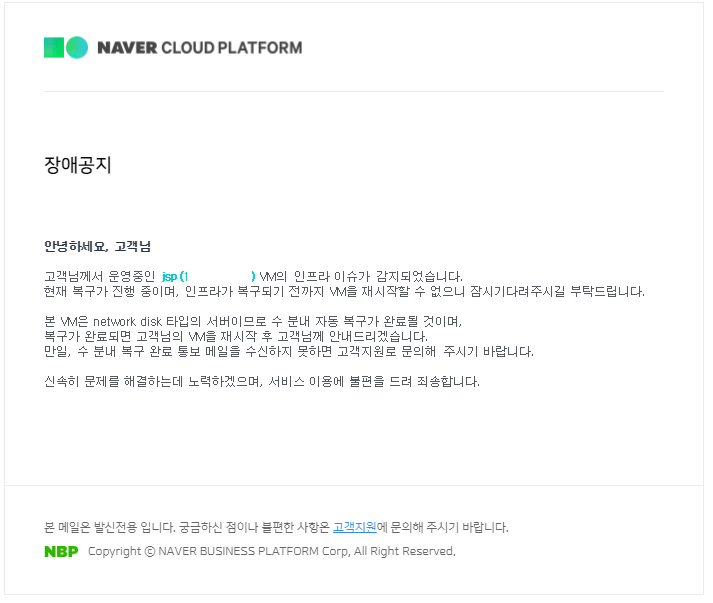 대학교 프로젝트 진행 하는 학생입니다. 네이버 클라우드 플랫폼에서 호스팅을 대여받아 개발을 진행하고 있는데 오늘아래와 같은 메일이 날라온후 웹사이트에 접속하려니 사이트에 연결 할 수없습니다. "" 에서 연결을 거부했습니다. 라고 뜹니다. ㅠㅠ VM 서버는 H/W Fault로부터 자동 복구되었다고 메일 날라왔는데도 접속이 안되요 ㅠ톰캣 재시작도 해보고 ㅜㅠ 방법을 모르겠습니다...