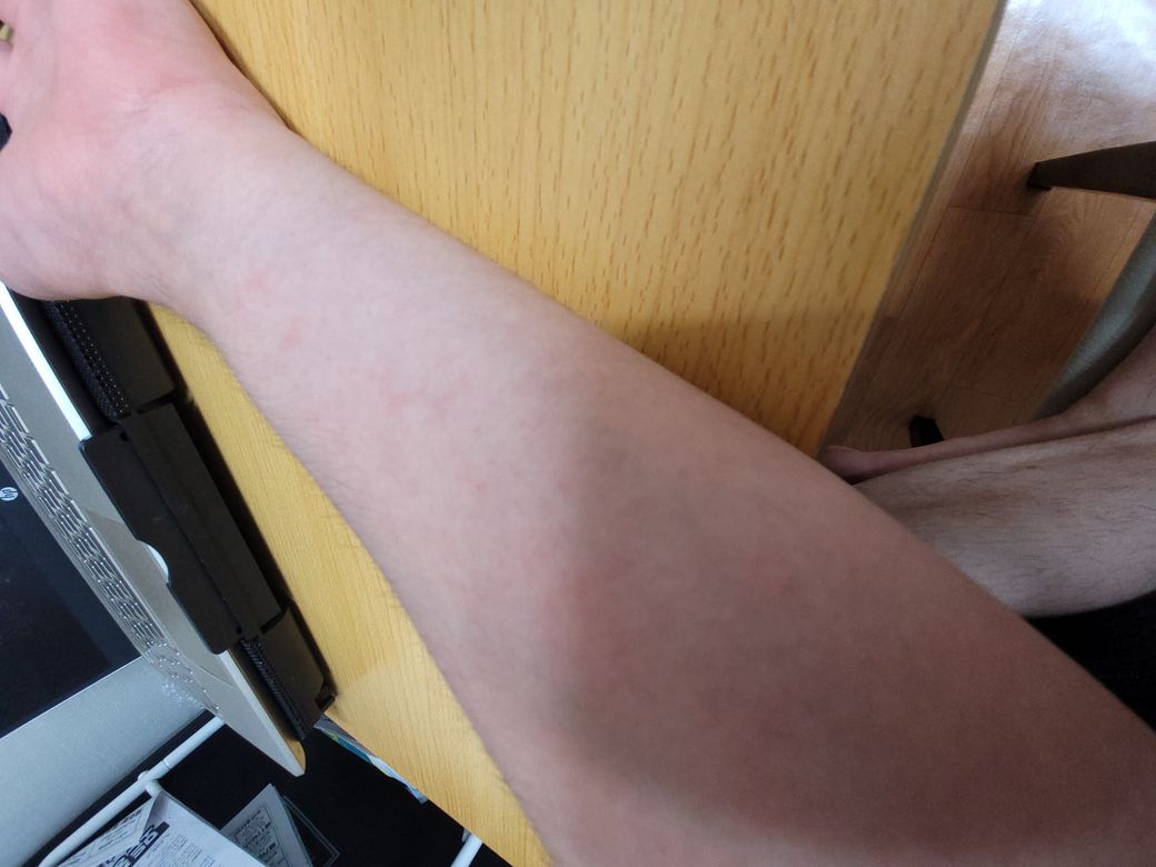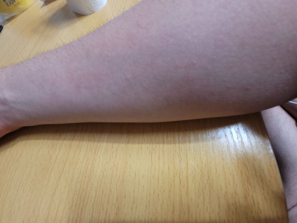 일한지 한달동안 큰 증상없이 모르고 있다가 오늘 장시간 근무하고 집에 와보니 이렇네요. 간지러운 건 딱히 없는 것 같아요.