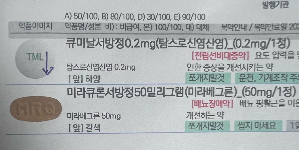탐스로신, 미라베그론 성분의 약을 드시고 두통이 있을 수 있습니다. 약을 복용하면서 두통이 반복된다면 진료를 보시고 약을 조절하는 것이 좋겠습니다.