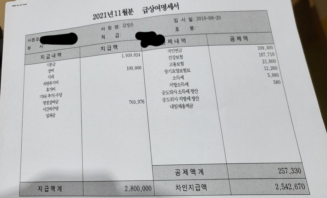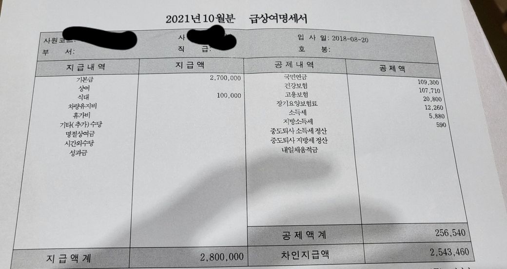입사한 18년중 부터 21년10월까지는 세무사와 회사가 연결되어 10월분처럼 기본급+식대만 있었는데요
