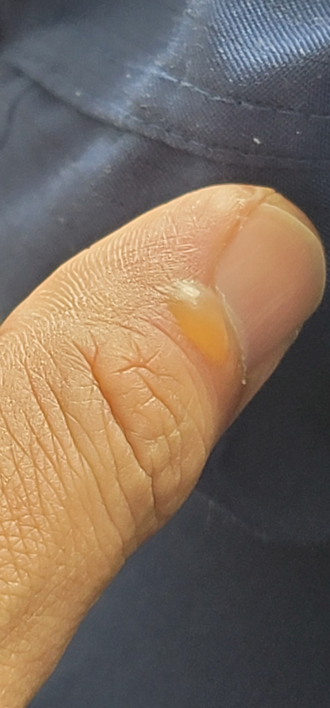 왼손 엄지손가락 손톱 뿌리쪽에 1cm정도 많이 부풀어 올라 물집이 잡힌 경우 물집을 임의로 터뜨리지는 말길 권장드리며 피부과를 방문하여 진료를 받길 권장드립니다.