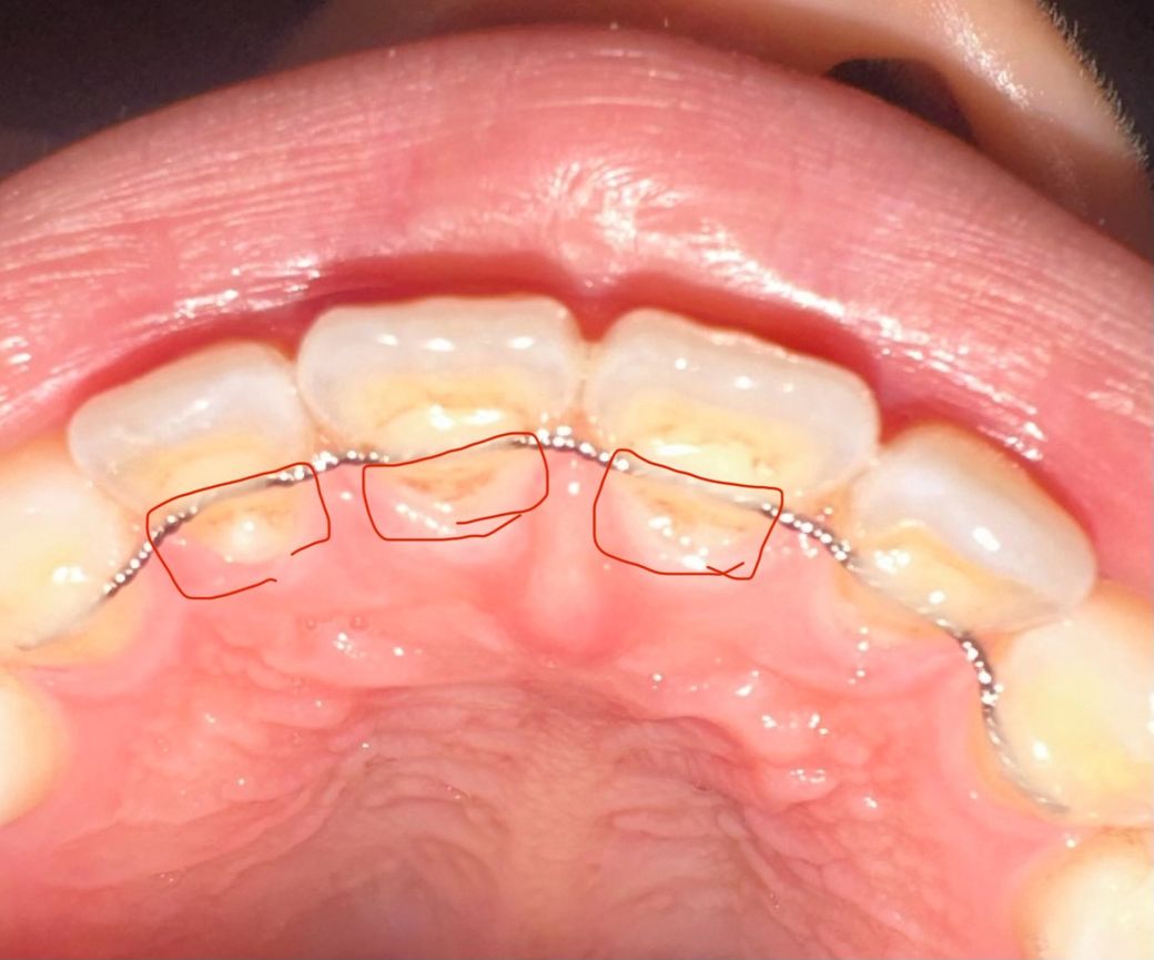 유지장치 붙은 앞니쪽에 검은게 보여요