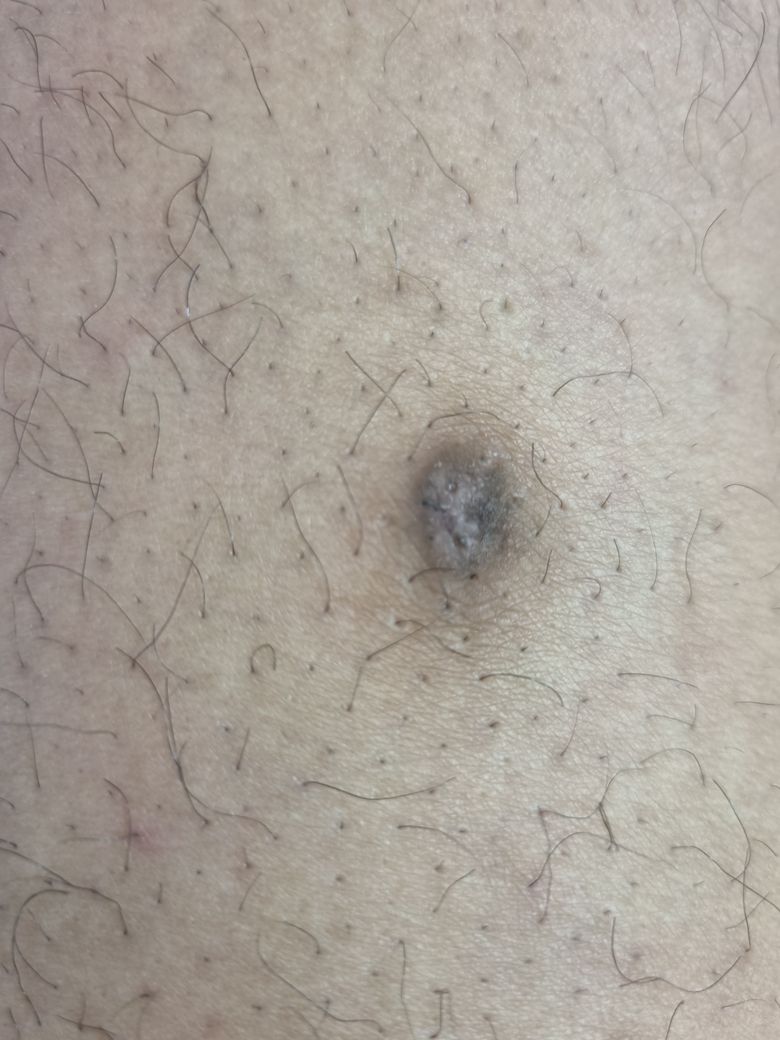 어느날 발견한 피부병변이 걱정스러우시군요. 모반의 경계가 명확하고 색이 균일한 편이라 보여 악성 종양인 흑색종의 가능성은 낮아보이지만, 없던 점이 발견된 상황이므로 피부과에서 확인해보시는게 안전하겠습니다. 가까운 의원을 찾아 진료받아보시기를 권해드립니다.