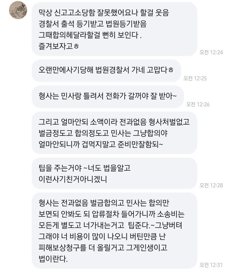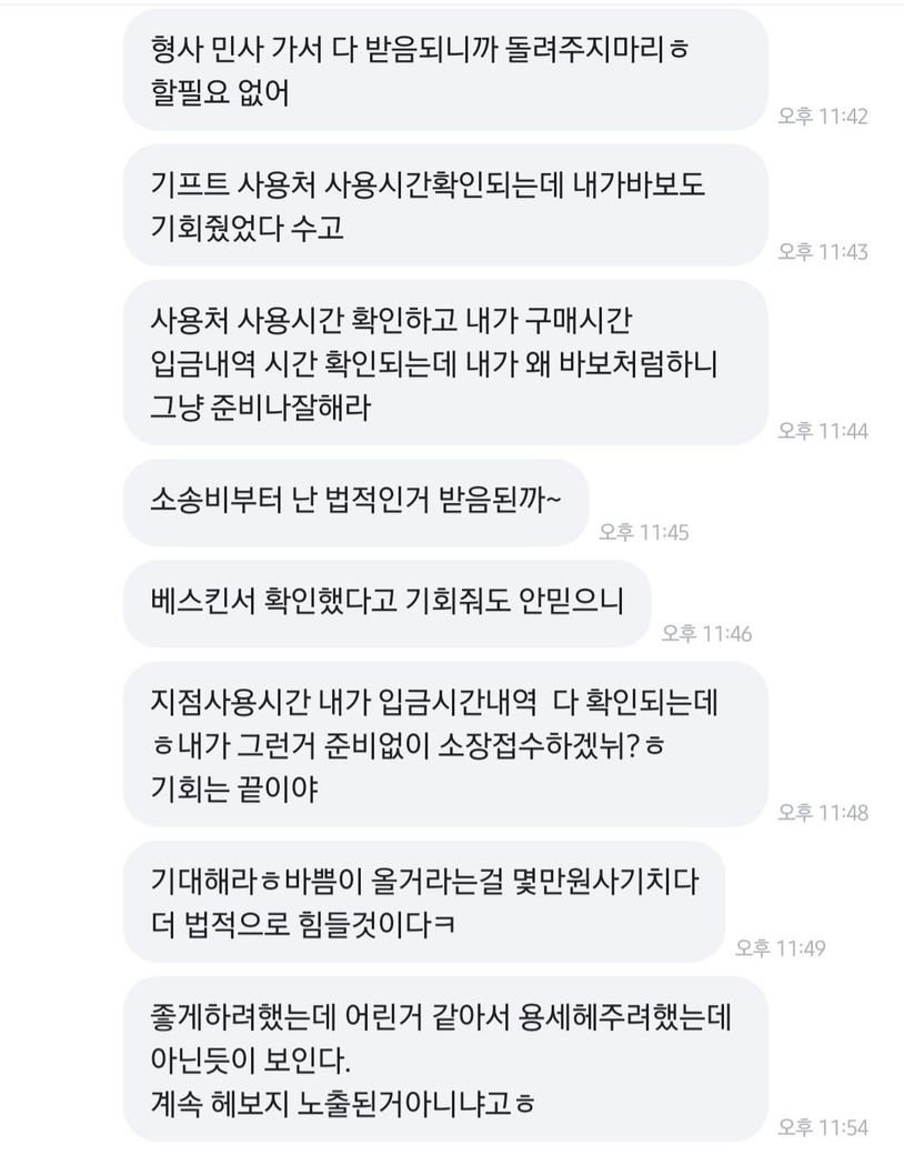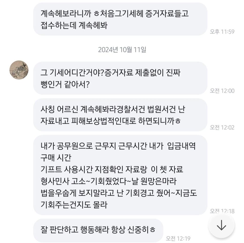"야이 사기꾼아", "경찰서 신고간다", "모지리놈 ㅋ", "내가 40대 공무원인데", "형사 민사 갈거다", "소장 접수 할서니까 니가 안해도ㅈ 되", "계속 해보라 그 기세어디간거냐 ㅋ", "찌질한 사기꾼아 ㅋ", " 변호사 사서 민사 진행한다"