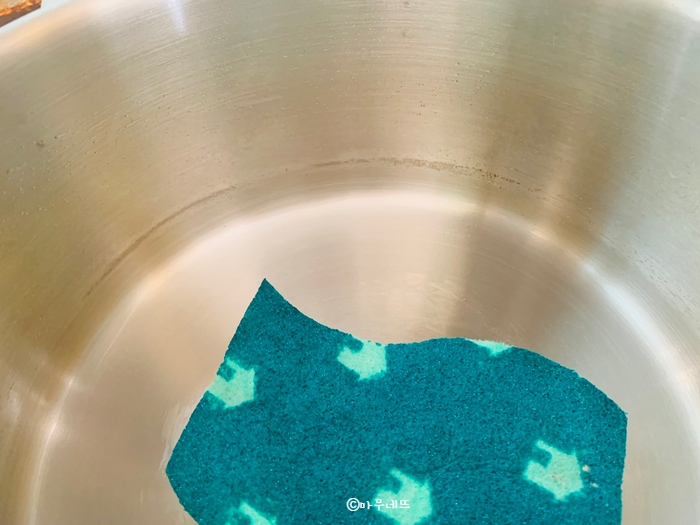 역시나 바닥 쪽은 그래도 효과가 있는 것 같은데, 물이 끓었던 부분에 생긴 띠 모양의 얼룩은 그대로예요. 초록색 부분으로도 문지르니 어느정도 사라지긴 했지만 전혀 만족스럽지 않은 결과네요.