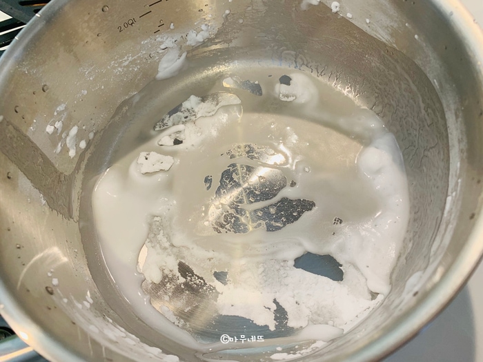 지난번에 프랑스 시댁에 어떻게 관리하시는지 여쭈었을 때 베이킹소다로 반죽을 만들어 사용하신다고 하셨어요. 그래서 혹시나 하는 마음에 베이킹소다를 넉넉히 넣고, 물은 조금 넣어 질척하게 만들었어요.