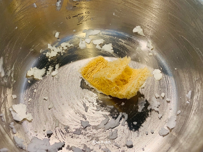 그리고 천연 수세미로 문질러주고 (힘주어 문지르지 않았어요!), 지우기 힘든 얼룩이 있는 부분에는 반죽을 두껍게 붙여줬어요. 그러고나서 15~20분정도 방치했습니다.