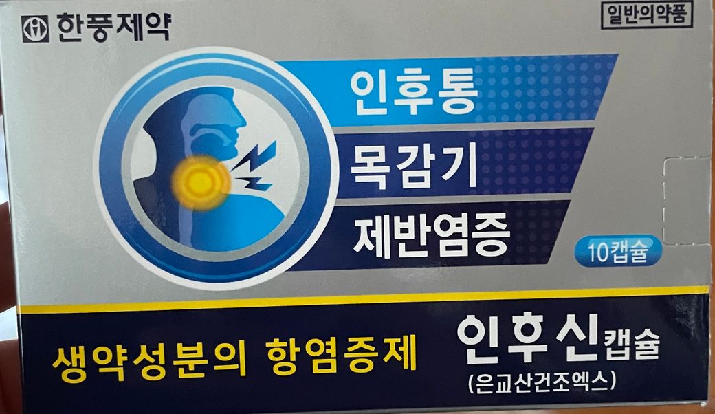 처방받은 약 먹었는데도 열,몸살,목구멍통증도 있어서 약국에서 산 약 ‘인후신캡슐(은교산건조엑스)-한풍제약‘