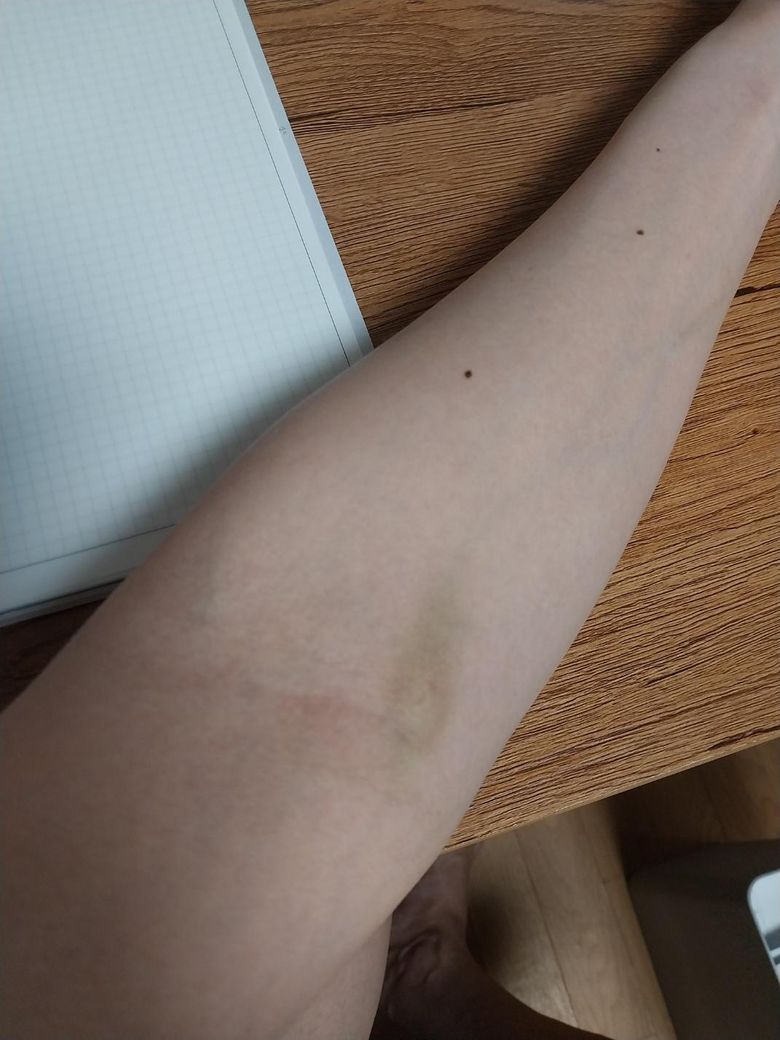 채혈 후 6일째에 멍이 생기고 눌러도 아프지 않으나 미묘한 자극이 느껴진다고 걱정하시는군요.