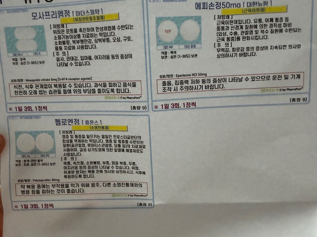 에피손정과 펠로엔정은 근이완제, 소염진통제라서 허리통증에 약효가 있지만