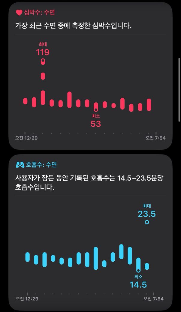 최근 이틀 간 데이터입니다.. 자는 도중 갑자기 심박수가 올라가는데 왜 저럴까요? ㅠㅠ 심장에 문제가 있는 건 아닌지 걱정됩니다.. 애플워치를 차고 자는데 단순 오류는 아닌 거 같아서요