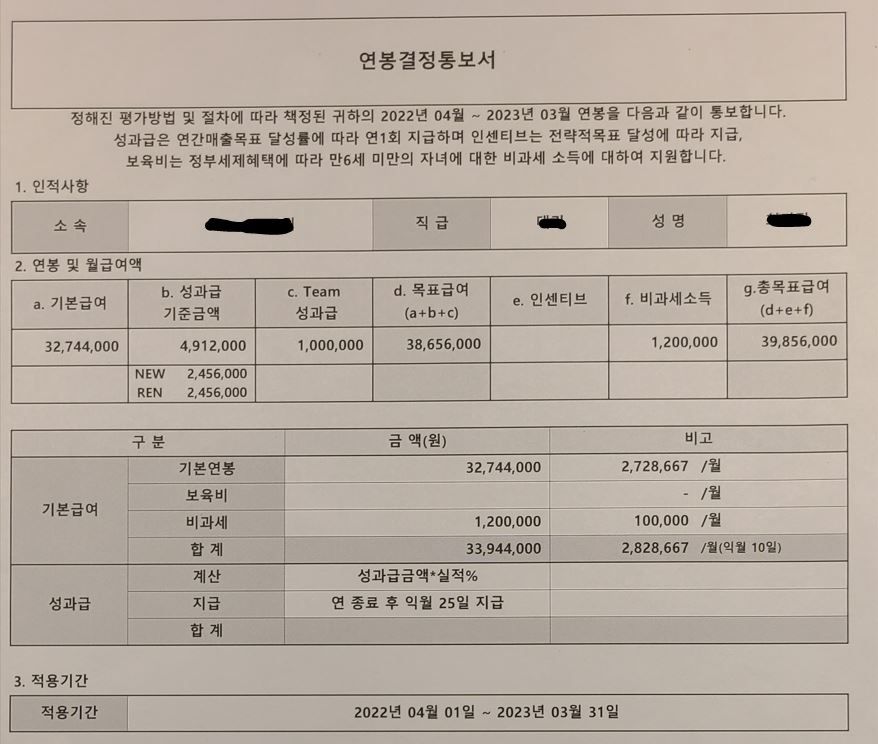 1. 연봉통지서보면 적용 기간이 2023년 3월31일로 끝났더라도 별도 연봉통지가 없었다면 기존 연봉으로 계속 연장되는 것으로
