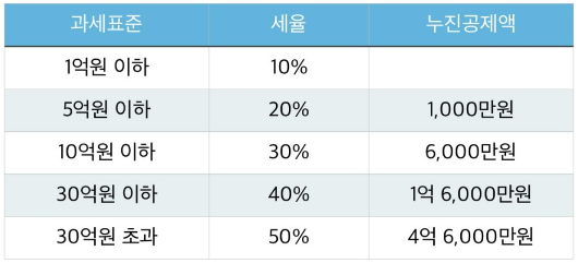 과세표준에 따른 증여세율은 다음과 같습니다.