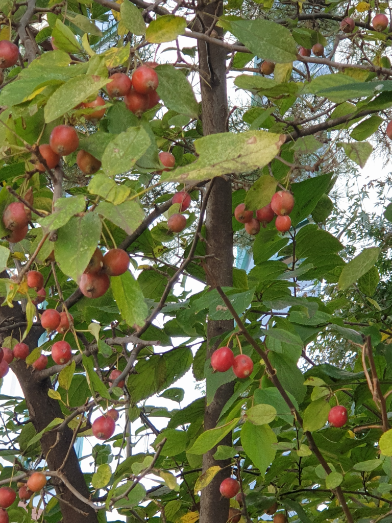 꽃사과 같아 보이네요. (애기사과) "산사" 라고도 합니다. 저희 고향에선 술로 담가서 어르신들이 조금씩 약으로 먹었던 기억이 있습니다. 피로회복이나 식욕증진,신경과민,불면증,변비 등을 치유하는 효과가 있는것으로 알려습니다.해서 약술로 많이 담가서 마시기도 합니다.