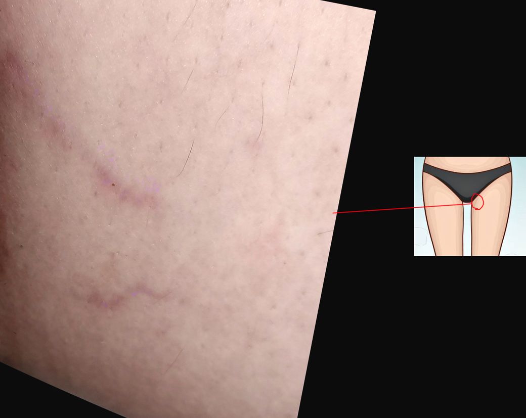 안쪽 허벅지에 요런 보라색 + 붉은색을 띄는 핏줄 같은게 보이는데요