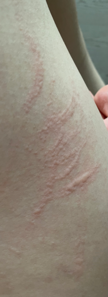 사진만으로는 정확한 진단이 어려울 수 있지만, 증상을 종합적으로 고려했을 때 두드러기일 가능성이 높아 보입니다.