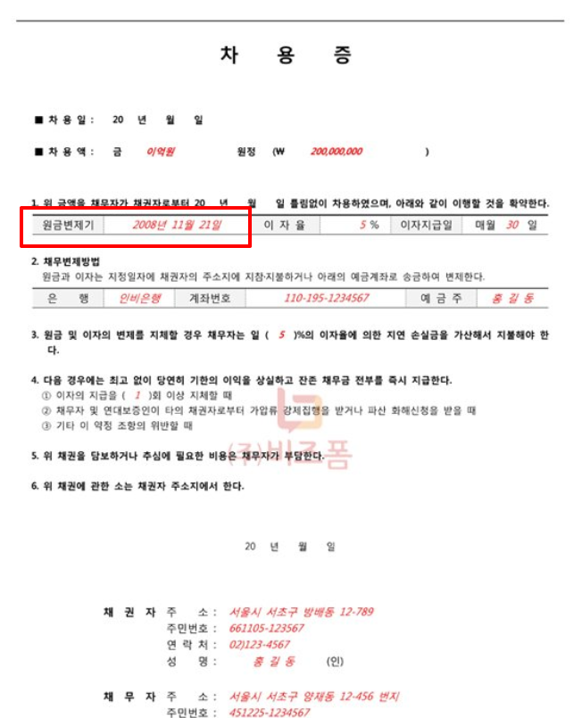 차용증 내용을 작성함에 있어 원금 변제기는 빌린 돈을 갚는 시기라고 알고 있습니다.