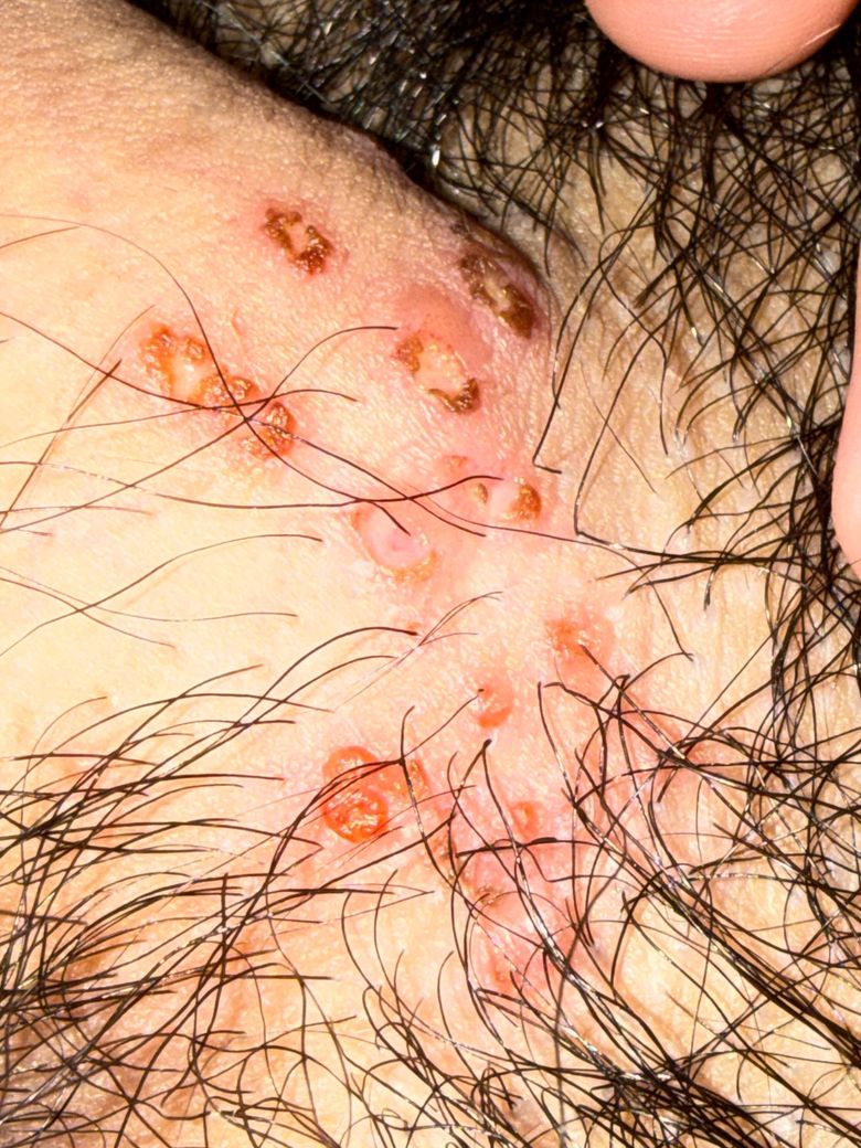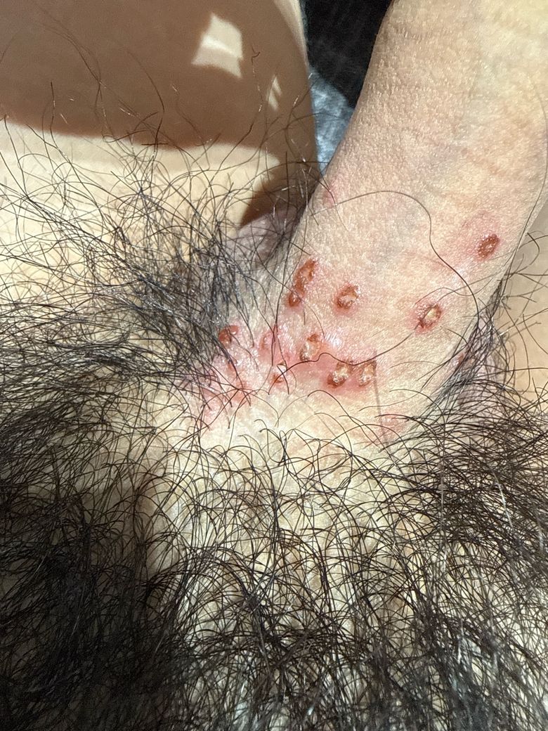 사진상 병변은 단순 모낭염보다는 헤르페스 가능성이 더 높아 보입니다. 모낭염은 보통 털을 중심으로 하나씩 생기는 농포 형태가 많은데, 현재 병변은 여러 개가 군집 형태로 모여 있고 일부는 수포가 터지면서 미란과 가피가 함께 보입니다. 이러한 양상은 단순 세균성 감염보다는 단순포진에서 더 전형적으로 나타납니다.