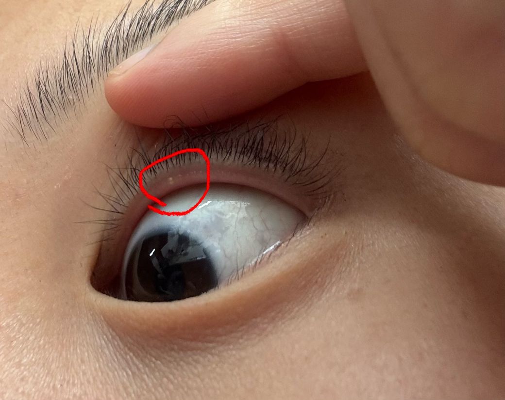 네 화장으로 인한 마이샘봄 막힘 때문입니다. 사진에서 보이는 것은 눈꺼풀 안쪽 가장자리(속눈썹 바로 뒤)에 작은 흰색 또는 노란색 점들이 다수 보이는 형태로, 임상적으로는 마이봄샘(Meibomian gland) 입구의 막힘, 즉 마이봄샘 기능이상에 해당하는 소견이 가장 흔합니다. 일종의 피지선이 막혀서 지방 성분이 고여 보이는 상태입니다.