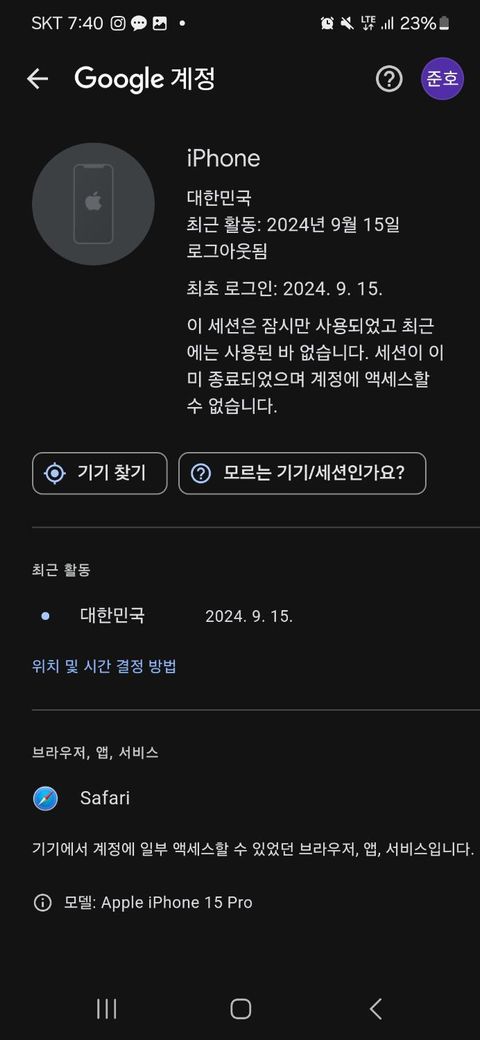 위사진과 같이 세션이 이미 종료되었으며 계정에 엑세스 할수없다라고 뜹니다. 이경우에는 로그아웃이 된건가요? 그리고 마지막 활동이 제가 로그아웃한 날짜랑 똑같은데 이경우에는 해당기기에서 제 계정을 이용하지 않은건가요?