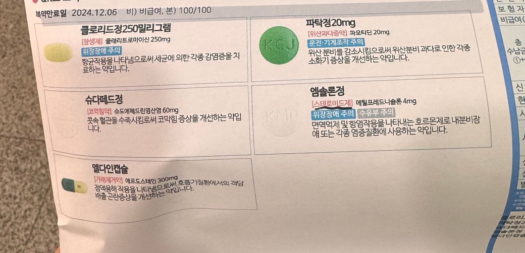 처방받으신 약은 항생제,스테로이드제등으로 위장장애가 있을 수 있으므로 식사를 못하실경우 해당 간식을 드시고 복용하시길 바랍니다.