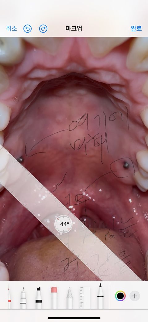 입천장에 식립한 미니스크류가 반대쪽에 비해 너무 누워있는듯 한데 아무 문제 없나요?