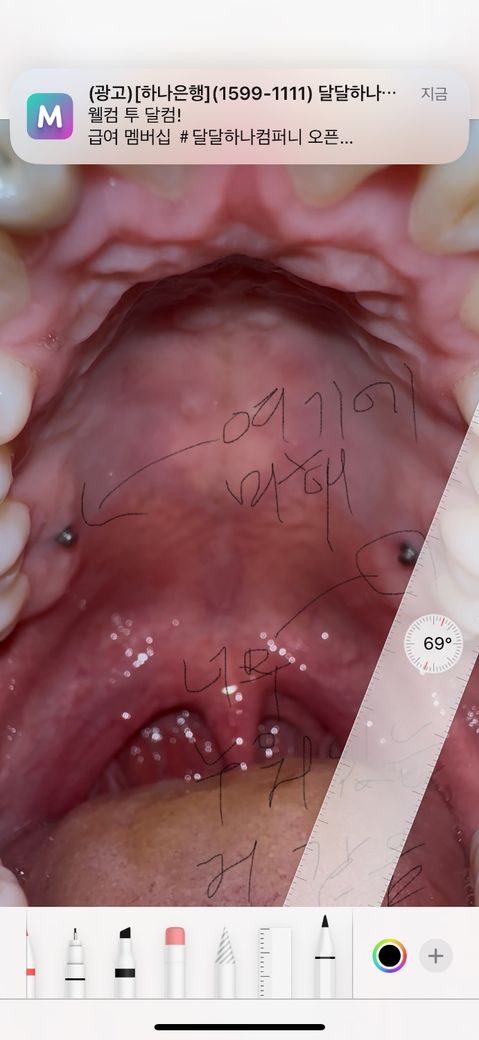 누워있는 쪽 미니스크류는 혀가 좀 많이 닿는 편이긴 한데 그래서 그런지 반대쪽에 비해 너무 누워서 박혀있는거 같은데 일부러 이렇게 박은건지 혀로 건들여서 위치가 틀어진건지 잘 모르겠네요 어때보이나요?