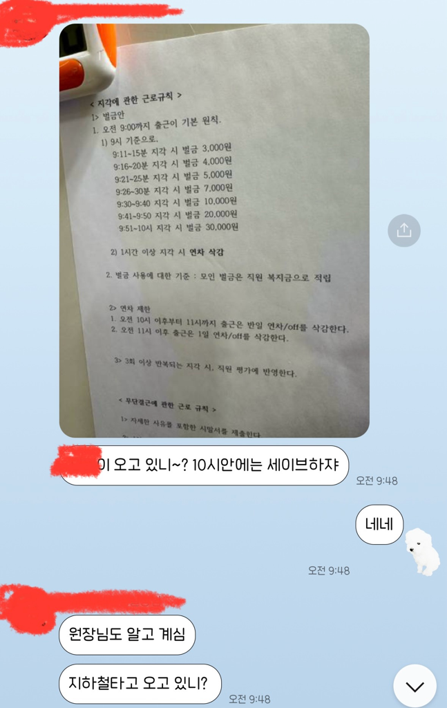 지각, 조퇴 등으로 근로를 제공하지 못한 시간에 대한 임금을 공제할 수는 있으나, 지각했다는 이유로 벌금을 사용자에게 납부할 법적 의무는 없습니다.