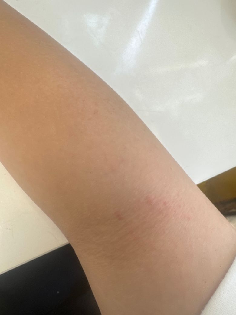 올려주신 사진상 작은 발진을 동반한 병변이 다발성으로 관찰됩니다. 현재 초기 병변으로 크기가 작아 정확하게 판단하기는 어렵지만 국소 피부염으로 인한 발진이 가장 가능성이 높습니다. 가려움이나 통증이 없다면 저절로 호전되는 경우도 있으므로 당장 진료가 필요하지는 않습니다. 수일간 경과 관찰해보시고 병변이 호전되지 않거나 악화될 경우 또는 가려움과 같은 동반 증상이 나타날 경우에는 피부과 진료를 보시는 것을 권해드립니다.