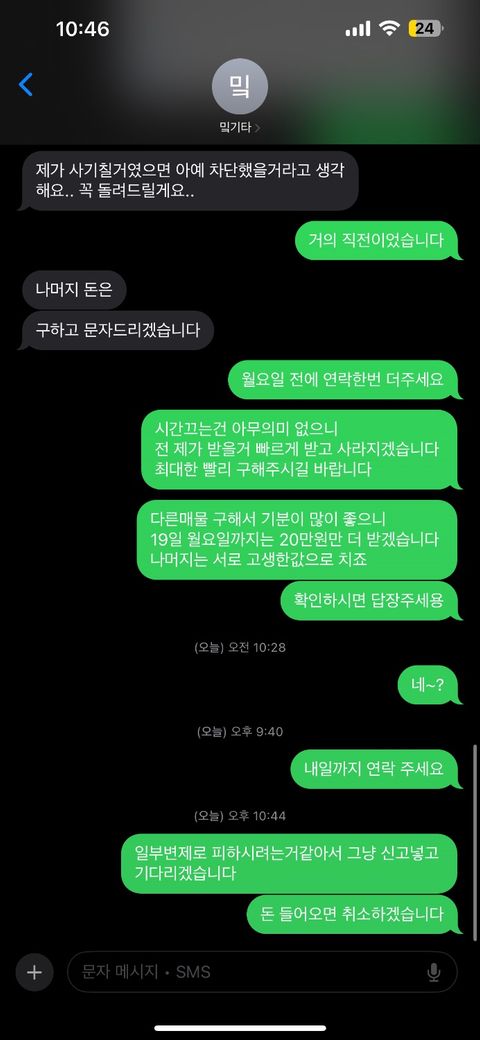 꺼림칙하여 연락처도 받고 문자로 거래하였으며, 34만원을 입금하였고, 물건을 보내주지 않아 환불해주지않으면 신고하겠다며 통지 후 돈이 없다고 하여 10만원을 부분환불 받았고, 나머지 금액은 받지 못한 채 연락두절 되었습니다. 해당10만원 환불에도 연락이 잘 되지 않아 어려움이 있었으나, 나머지 금액을 생기는대로 줄것을 요구했는데, 이후 찾아보니 부분변제를 했을때 가해자에게 조금더 유리해진다고 하는 이야기를 봐서