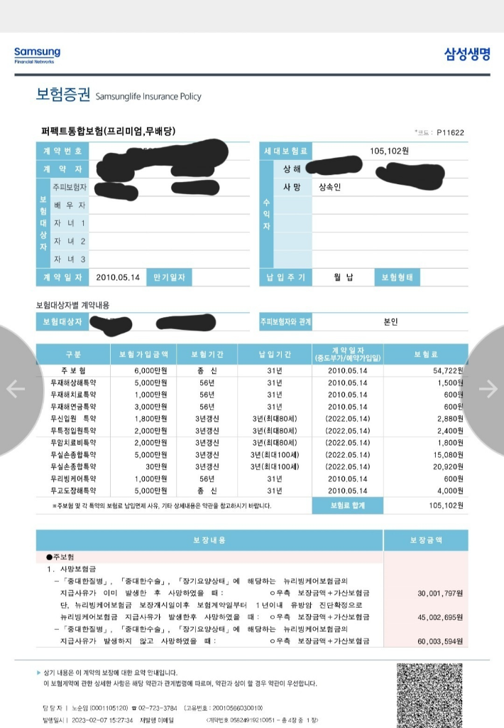 보험료도 그렇게 비싼편은 아니시고 실손도 3년갱신인 2세대 실손이시구요.
